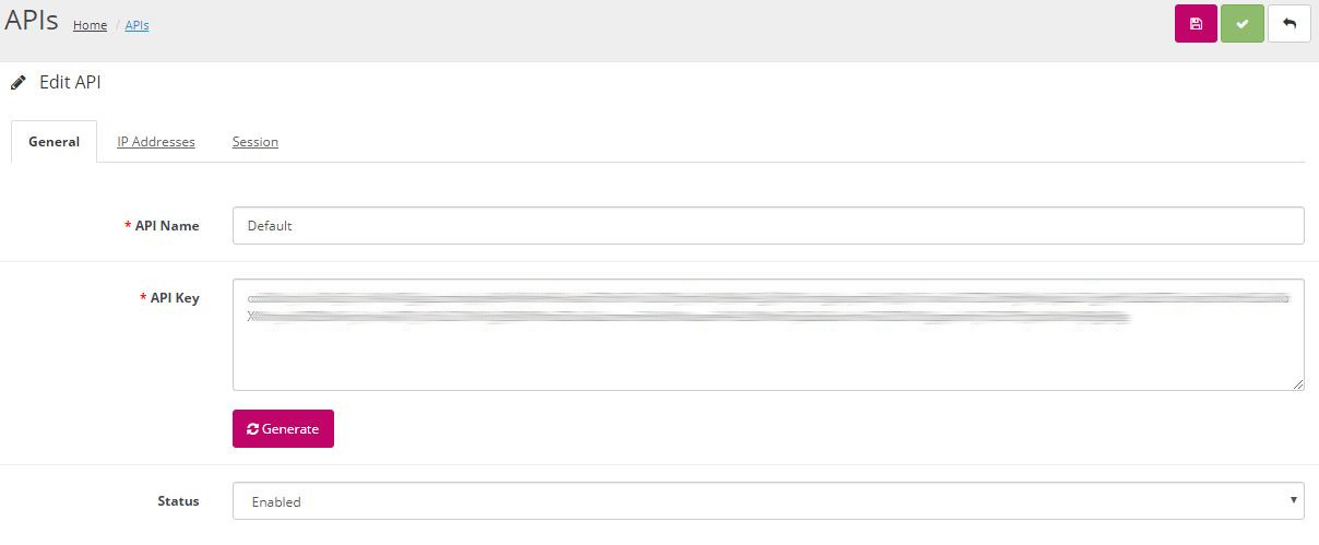 In order to start using API we have to add a new API user and allowed IP addresses - System - Users - API. The API key can be generated automatically after clicking on generate button.